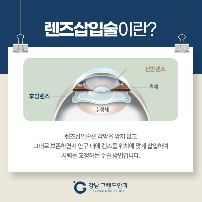 라식, 라식이 어려운 초고도 근시나 난시, 각막 변형을 원하지 않는 분이라면 렌즈 삽입 수술이 대안이 될 수 있습니다. 초고도 근시나 고도 근시의 경우 일반 레이저 시력교정술을 시행하면 각막을 깎아야 하는 양이 많아 수술이 불가능한 경우가 많습니다. 그러나 렌즈 삽입술을 이용하면 개별 도수에 맞는 특수 렌즈를 이용하여 교정이 가능합니다. 강남 렌즈 삽입술이 궁금하신 분들을 위해 좀 더 자세히 알려드리겠습니다. 렌즈 삽입술